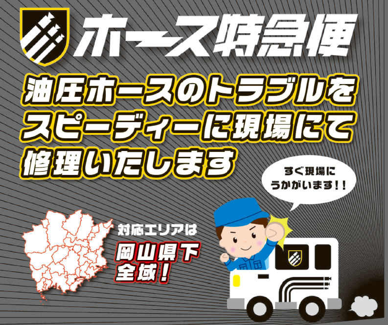 当社では、岡山県内全域を対象に、油圧ホースのトラブルを電話一本で受け付け、現場に駆け付けて迅速に解決するサービスを提供しています。